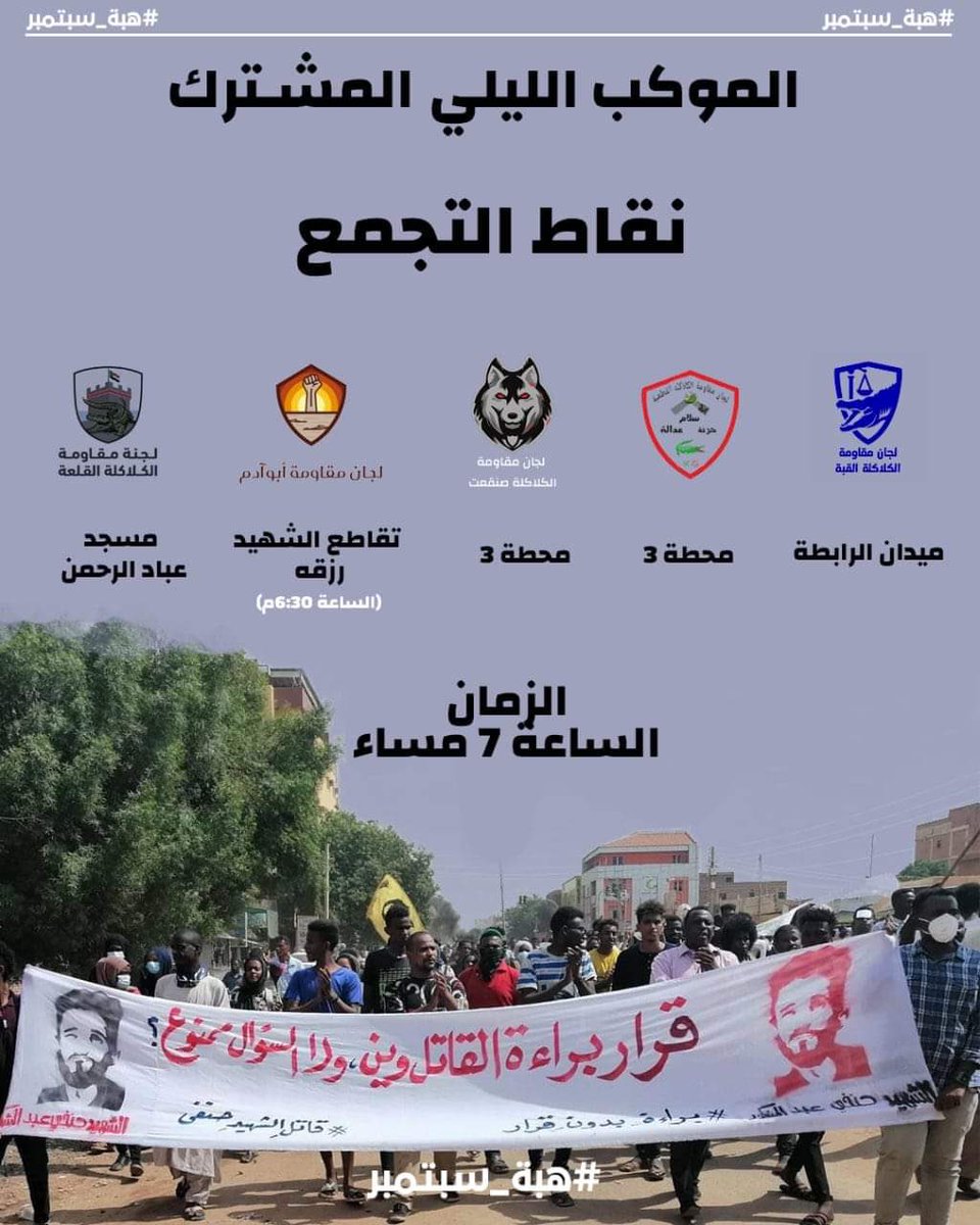 نحن في لجان مقاومة الكلاكلات وجنوب الخرطوم نؤكد أن قطار الثوره قد إنطلق وأنه سيواصل لمحطته الأخيره بلا شك وإيمانا منا بالعمل داخل الأحياء وتغيير التكتيكات الميدانية إستجابة لضرورة عودة مظاهرات الاحياء ندعوكم للخروج غدا في مواكب ليلية في كل من مناطق ⬇️