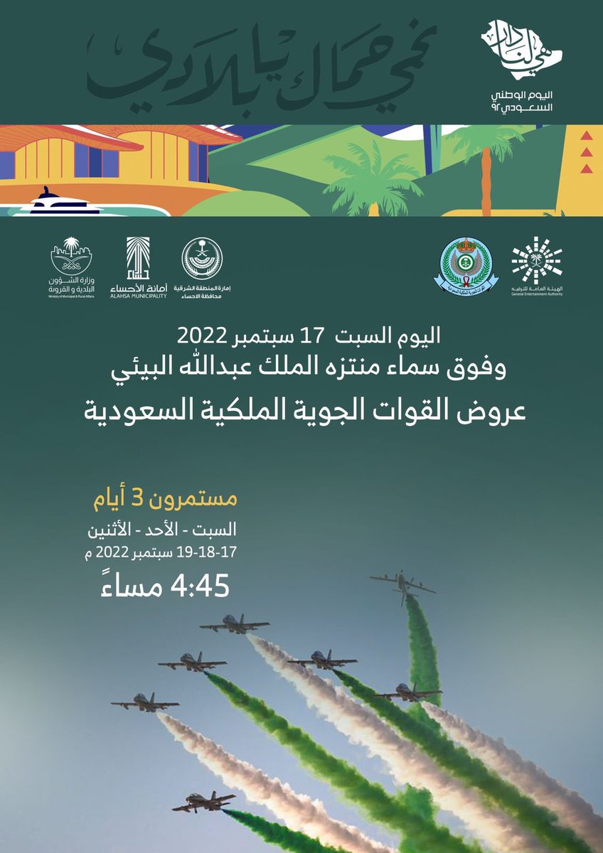 عروض القوات الجوية الملكية السعودية بانتظاركم عصر اليوم في منتزه الملك عبدالله البيئي بالأحساء .