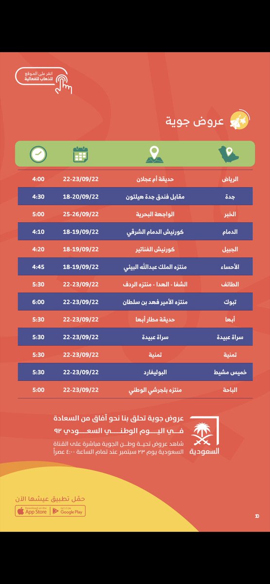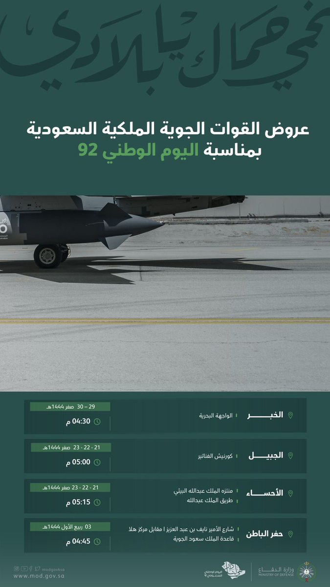 تعرّف على مواقع ومواعيد عروض القوات الجوية في المنطقة الشرقية بمناسبة #اليوم_الوطني_٩٢ والتي ستكون في كل من :