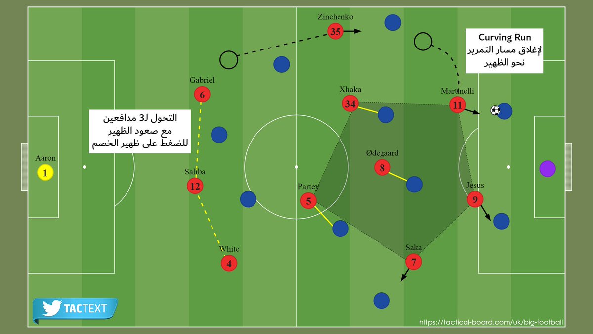 التدوير التموضعي Positional Rotation خلال عملية الصعود بالكرة يهدف لتعقيد مهمة الخصم في رقابة لاعبي #أرسنال ويمنحهم الفرصة والوقت للخروج من الضغط والتقدم بالكرة للأمام