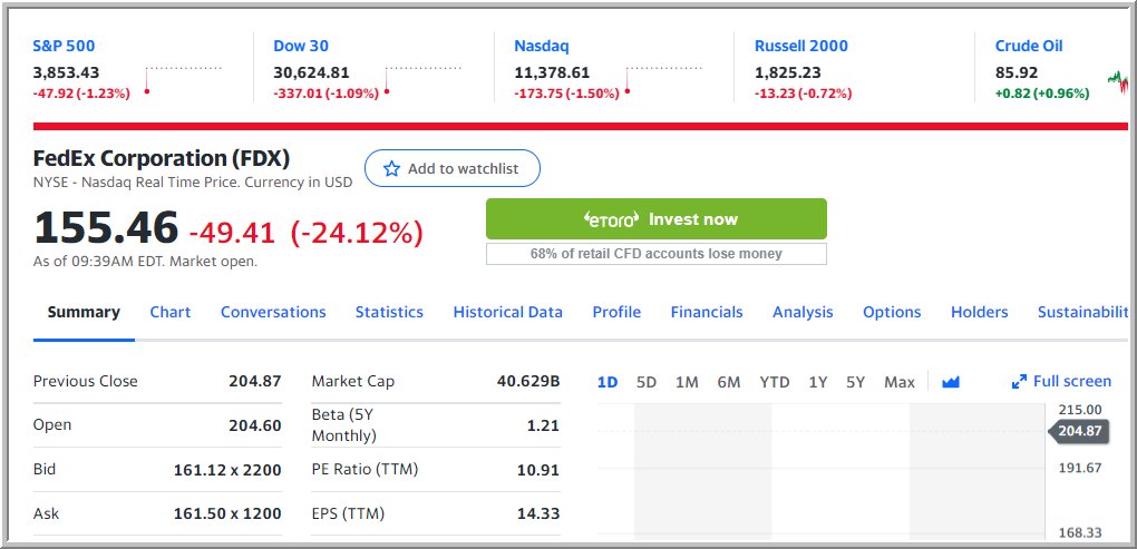 سهم فيدكس يهبط بـ 24% ليسجل 155.46$ عند افتتاح السوق الامريكي اليوم الجمعة، ويسحب معه المؤشرات الامريكية لتواصل هبوطها المستمر.. الفدرالي يبدو انه (سيهبد) السوق (هبداً)