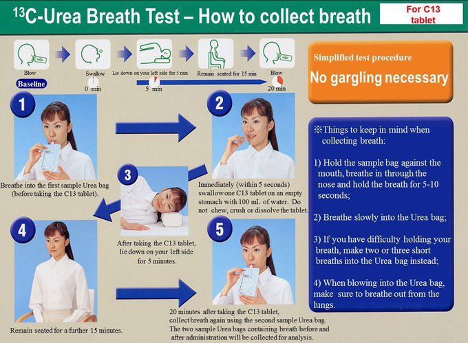 يتم النفخ في كيس يشبه البالون، بعد بلع حبة او شرب محلول يحوي جزيئات كربون موسومة