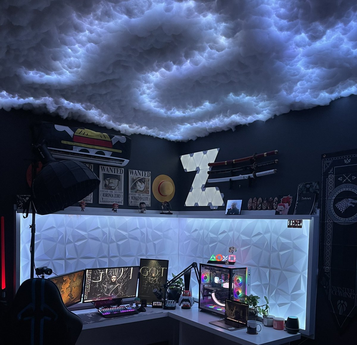 اولاً | من الأشياء التجميلة للغرفة هي الغيوم بحيث إنها تعطيك منظر رهيب وإضاءة خفيفة، مثلًا نفس هذي الغرفة، نسبة كبيرة من جماليتها هي الغيوم ☁️