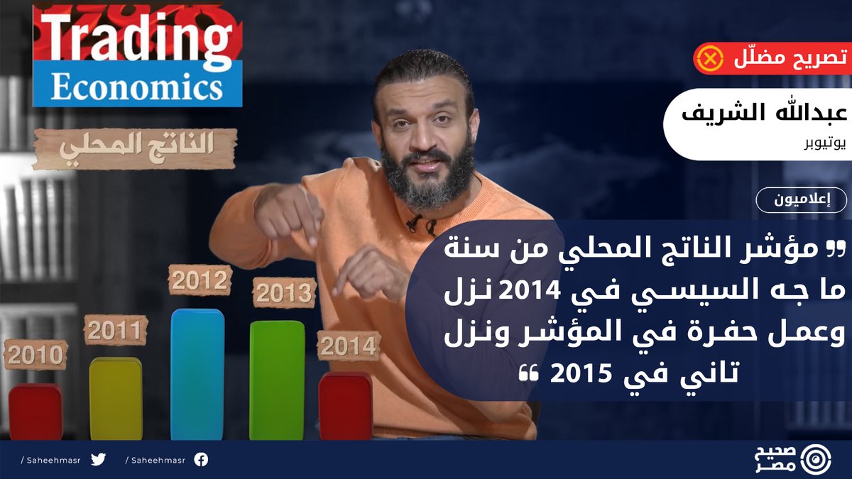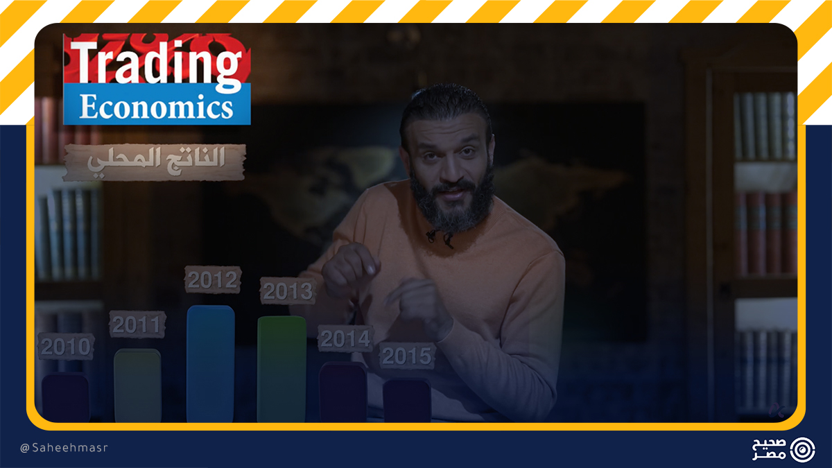 ✅ واللافت أن عبد الله الشريف، عرض خلال حلقته، إنفوجراف لتهاوي الناتج المحلي بعد وصول الرئيس السيسي للرئاسة، ونسب تلك الأرقام الخاطئة إلى Trading Economic، وطالب المشاهدين بالعودة للمصادر للتأكد من صحتها.
