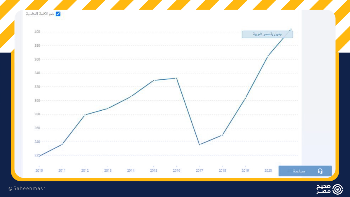✅ وبالعودة إلى مؤشر البنك الدولي زاد الناتج المحلي من العام 2013- وقت حكم الإخوان المسلمين- من 288.4 مليار دولار إلى 305.6 مليار مع تولي السيسي، ووصل الناتج المحلي في العام 404.1 مليار دولار.