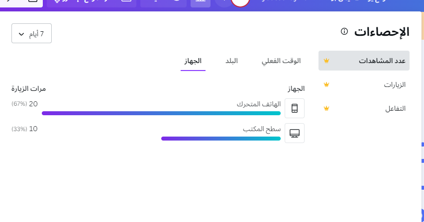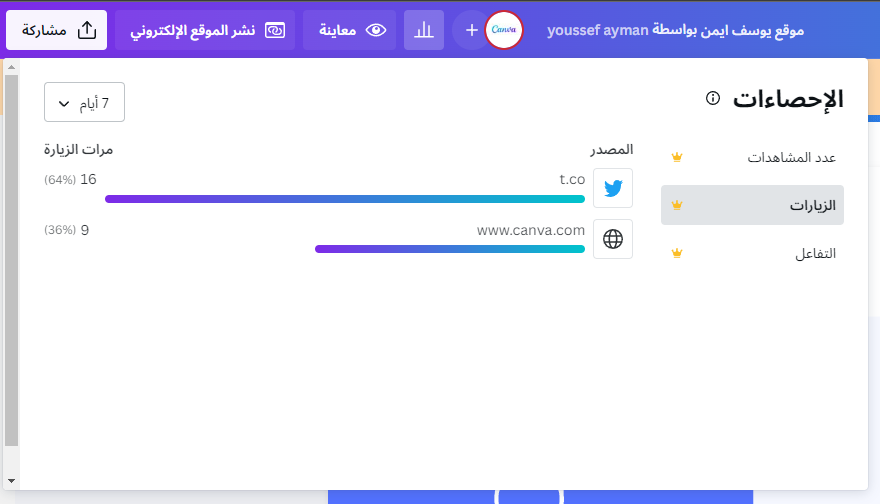 كمان كانفا يعطيني تحليلات رهيببة جدًا 💜💜💪 مثل وين مصدر زائرين الموقع حقك ؟ وايش التفاعل على موقعك