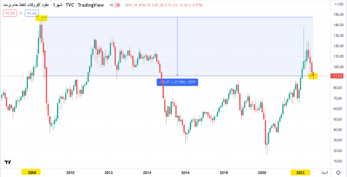هل تعلم بأن قيمة #برنت بسعر 91.53 دولار (أغلاق يوم الجمعة) أعلى من قيمته في العام 2008م عند مستويات الـ 140 دولار!!