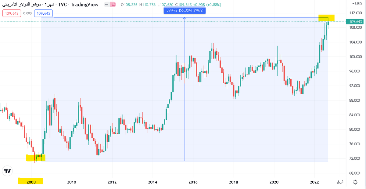 عام 2008م كان مؤشر الدولار عند مستوى الـ 73 نقطة بينما اليوم عند مستوى الـ 109.64 نقطة (مرتفعاً بنسبة 55%) وخام برنت (منخفضاً بنسبة 38%) فقط من قمة 2008م .