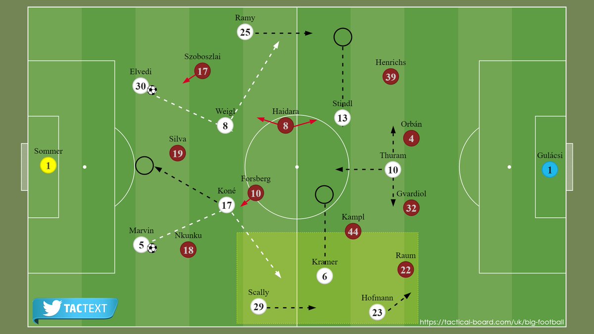 - ضغط لايبزيغ لم يكن مناسباً خصوصاً مع المرونة الممتازة للاعبي غلادباخ في التحول أحياناً لـ3 مدافعين مع نزول كونيه (اللاعب الأفضل في الشوط الأول بنظري)