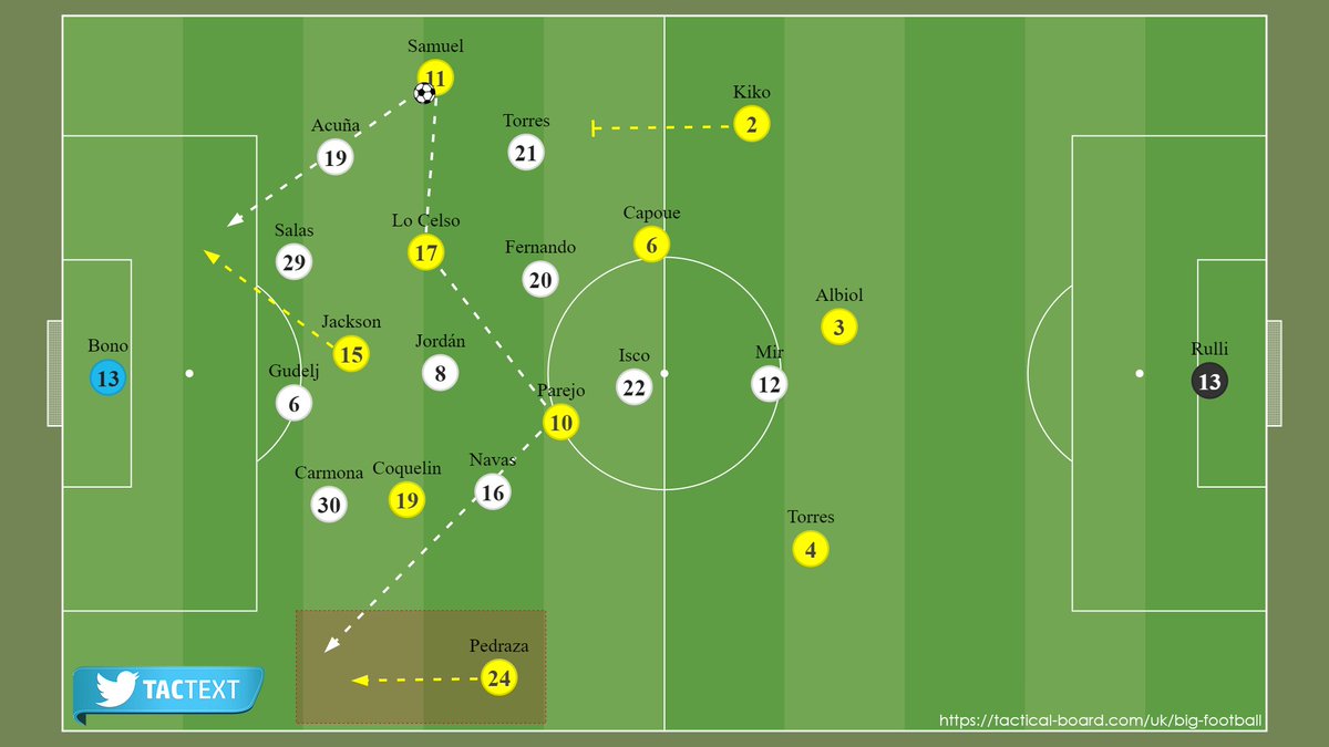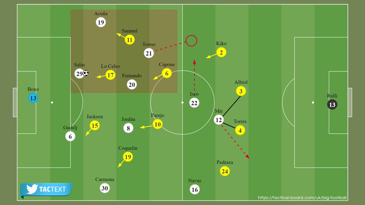 - يحاول خلق تفوق عددي أمام ضغط فياريال عبر نزول توريس لمساندة ثنائي الارتكاز فيرناندو وجوردان؛ وخلال ذلك يتحول ايسكو للجهة اليسرى لتثبيت ظهير فياريال الأيمن مع ثبات مير بين قلبي الدفاع