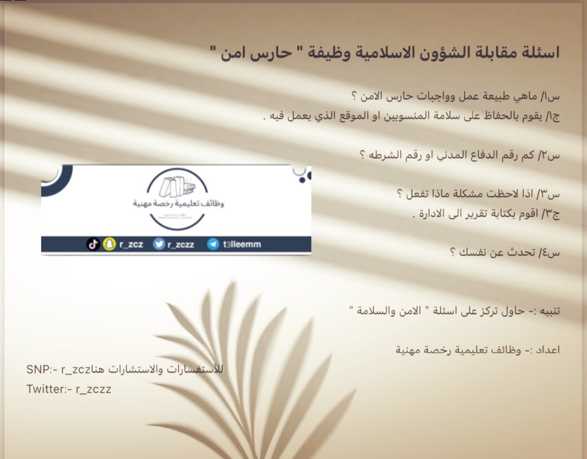 اسئلة #المقابلة_الشخصية في الشؤون الاسلامية لوظيفة " حارس امن " 🔰