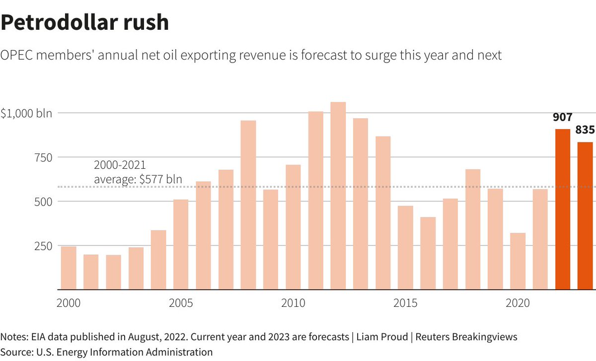 سيقوم مصدري النفط هذه السنة بـ تحقيق أرباح هائلة ، حيث يتوقع أن يحصدوا ما يقارب من 907 مليار دولار في نهاية العام ، و هذا أعلى رقم خلال الـ 7 سنوات الماضية ، حصة #السعودية و الخليج منها : 410 مليار دولار !