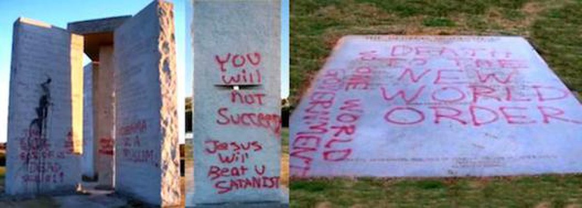 في 2008 تعرضت الالواح لتخريب من خلال الكتابة عليها بواسطة الطلاء . حيث اعتقد بعض من بعض الناس ان هذه الالواح تتبع ديانة شيطانية . و ان اتباع الشيطان هم من قاموا ببناءها . وأنها عبارة عن وسم موت للعالم