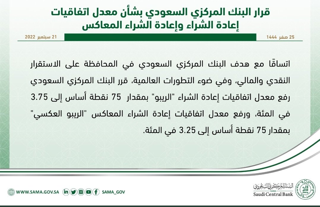 البنك المركزي السعودي قرر رفع معدل اتفاقيات إعادة الشراء الريبو بمقدار 75 نقطة إلى 3.75 في المئة.