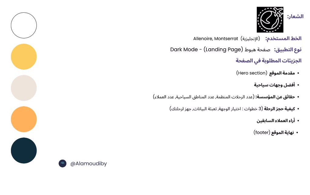 التحدي السادس فكرته تصميم موقع Dark Mode بمنظمة تنظم رحلات سياحية. طابع التصميم الفخامة والإحترافية وتحفيز الناس على تجربة رحلاتهم.