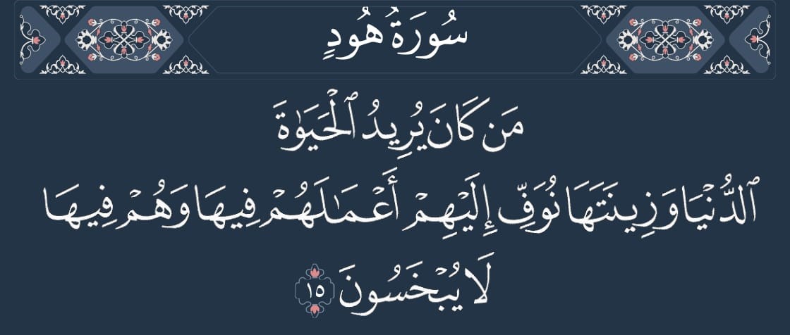 * عبارة "نوف إليهم أعمالهم" توحي أن نيل الدنيا بحسب قوة الإرادة مع العمل والظروف وليس حسب النيات أو العقيدة "كلا نمدّ هؤلاء وهؤلاء من عطاء ربك وما كان عطاء ربك محظورا".