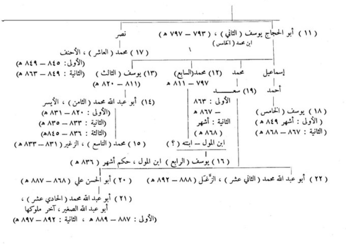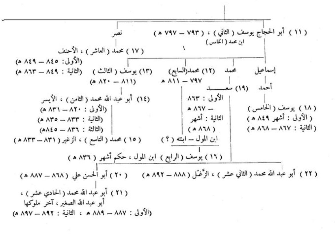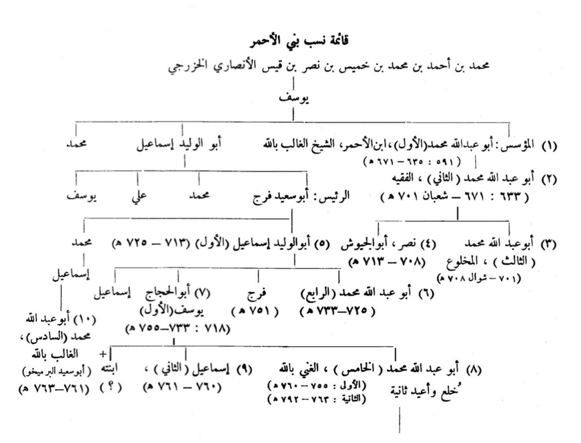 وللتذكير فهذه مشجرة ملوك بني نصر من كتاب الدكتور @aaelhajji (التاريخ الأندلسي) لمحاولة فهم تاريخ القصر ومن بناه بشكل أدق