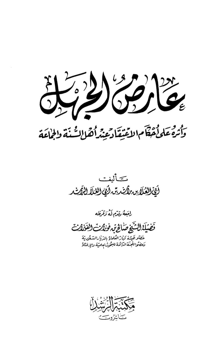 ٣- كتاب «عارض الجهل، وأثره على أحكام الاعتقاد عند أهل السنة والجماعة» لأبي العلا الراشد، وتقديم الشيخ صالح الفوزان.