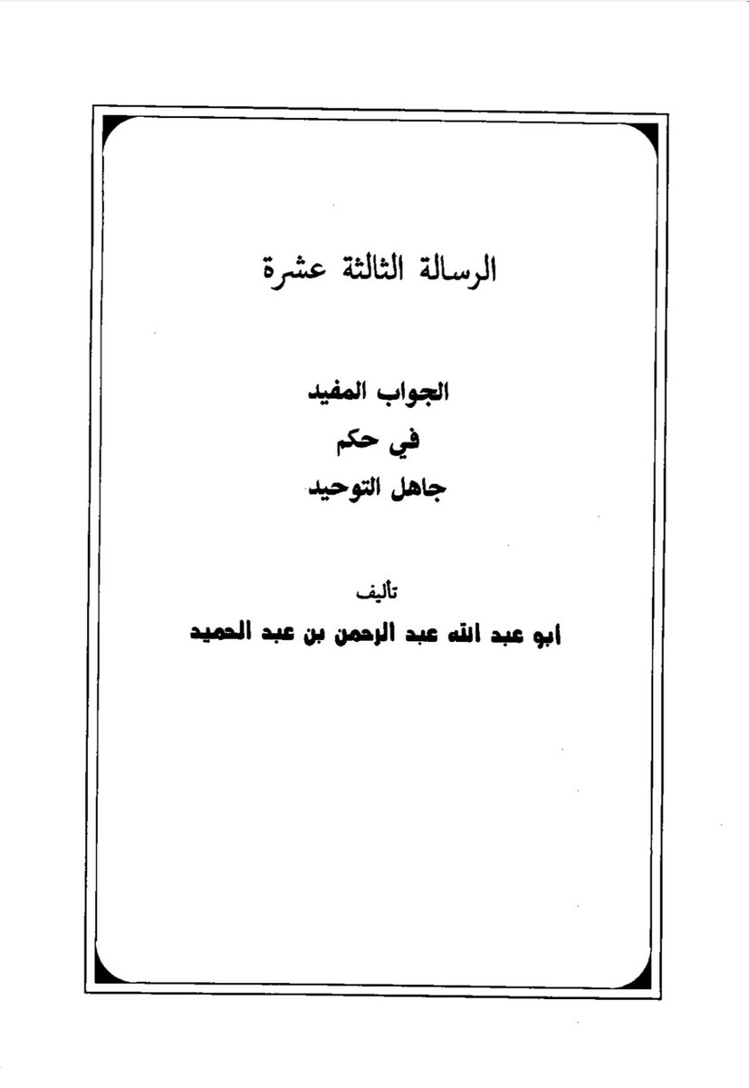 ٢- رسالة «الجواب المفيد في حكم جاهل التوحيد» لأبي عبدالله عبدالرحمن بن عبدالحميد، ضمن رسائل «عقيدة الموحدين» التي جمعها الشيخ عبدالله بن سعدي العبدلي، وقدّم لها الشيخ عبدالعزيز بن باز.