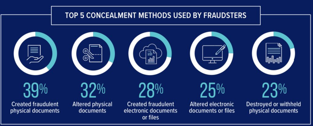 ٦١٪ ممن يقومون بعمليات التزوير هم مدراء في تلك الجهات، و ٤٨٪ من الأدلة يتم اتلافها من قِبل التنفيذيين