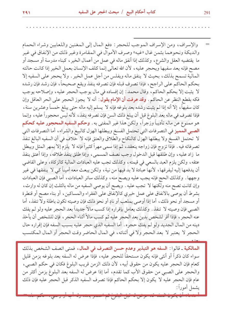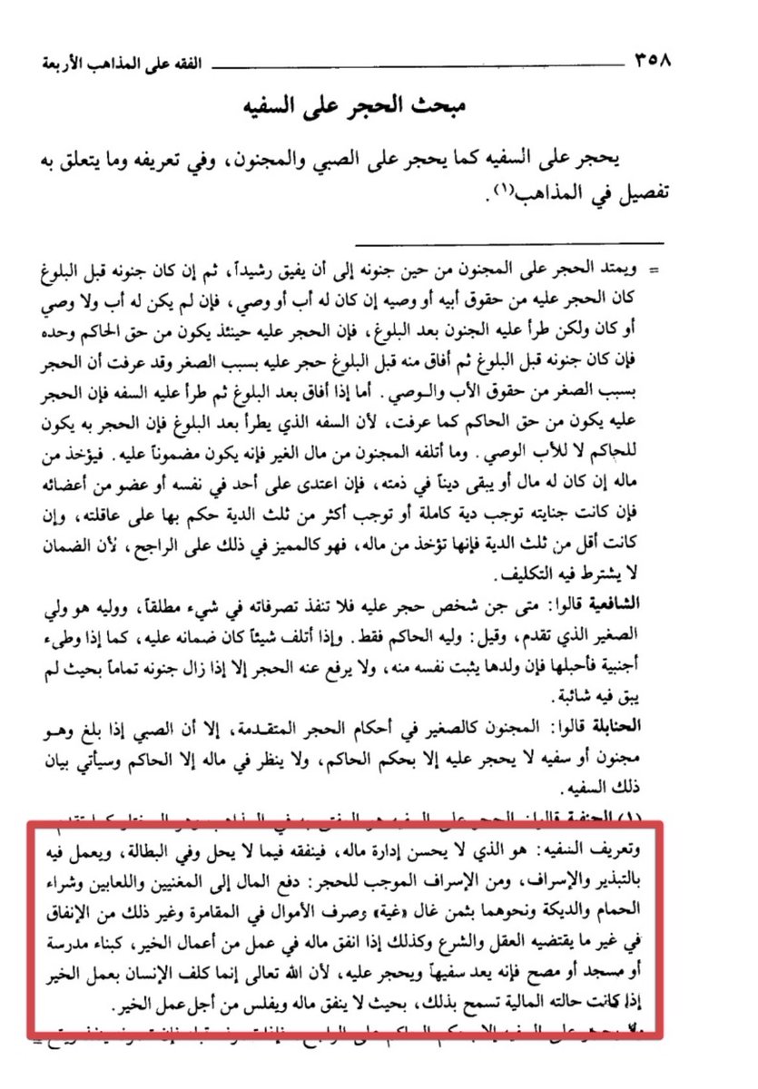 وتعريف السـ،فيه هو الذي لا يحسن إدارة ماله فينفقه فيما لا يحل وفي البطالة ويعمل فيه بالتبذير والإسراف ومن الإسراف الموجب للحجر الدفع إلى المغنيين واللعابين . . .