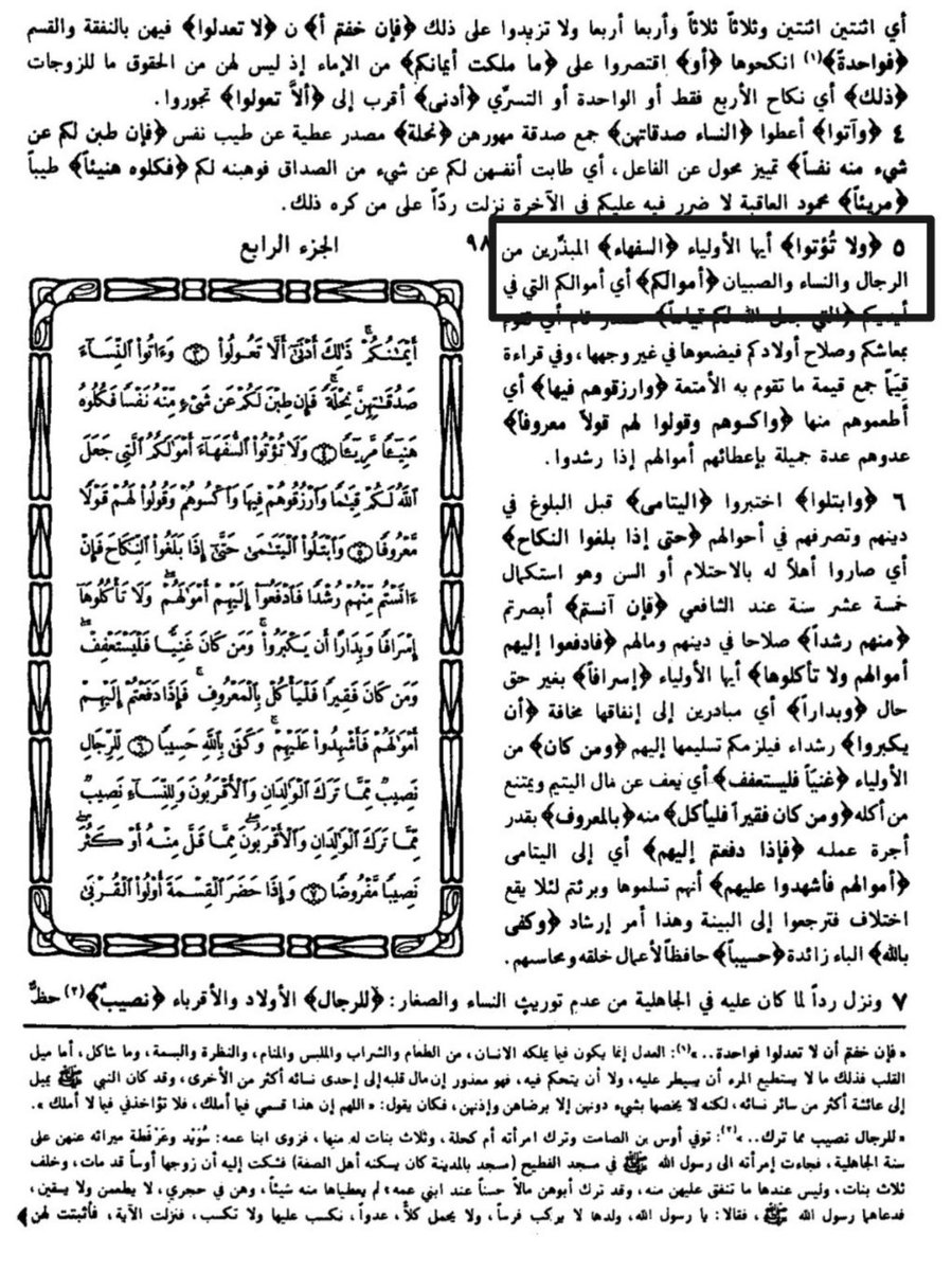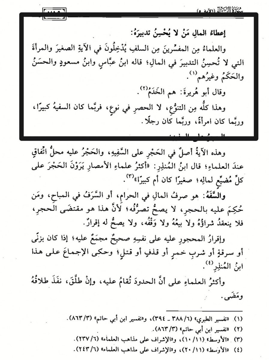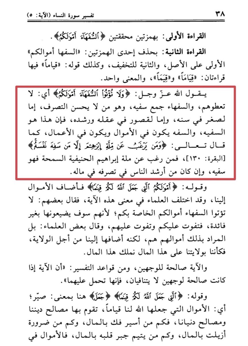مسألة لم يأت في القرآن أن النساء سفـ،هاء أما الصبيان فنعم وأما النساء فلا لأنه لم يأت قرآن ولا سنة بأنهم سفـ،هاء بل قد ذكرهن الله مع الرجال في سائر أعمال البر