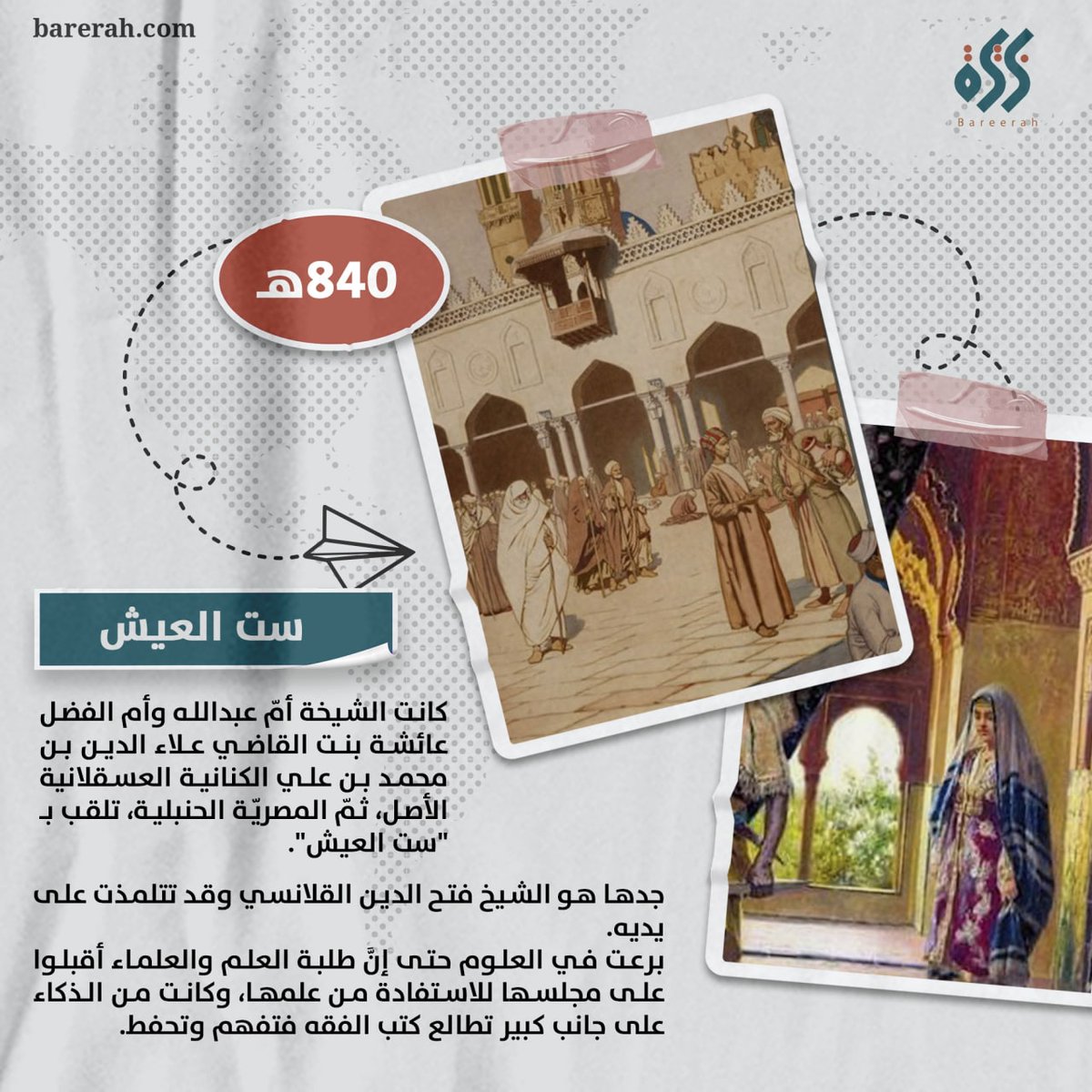 وفيها معروف وشفقة سيما على ذوى رحمها ومحافظة على الصلوات والصوم مع صفاء وسرعة بادرة؛ ومات كل من الأخوين في غيبتها معى فصبرت عوضنا الله وإياها خيرا ثم عادت معى إلى مكة فحجت ودامت حتى ماتت ي ليلة الخميس سادس عشر رمضان سنة سبع وتسيعين شهيدة بالبطن والغربة بعد تعلل طويل (3)