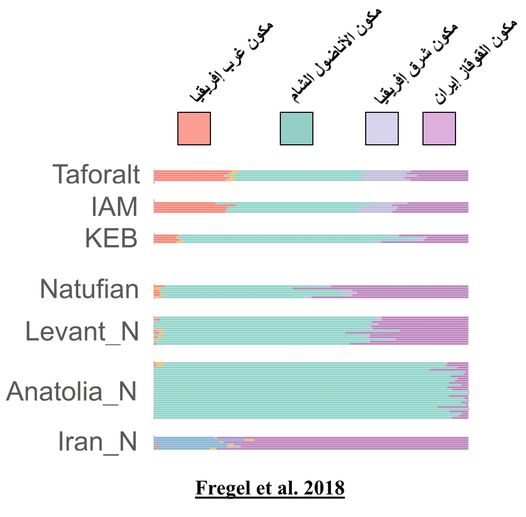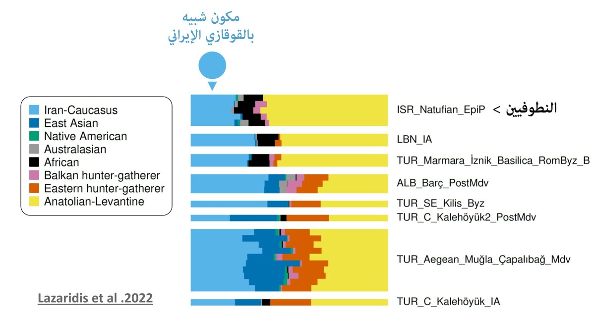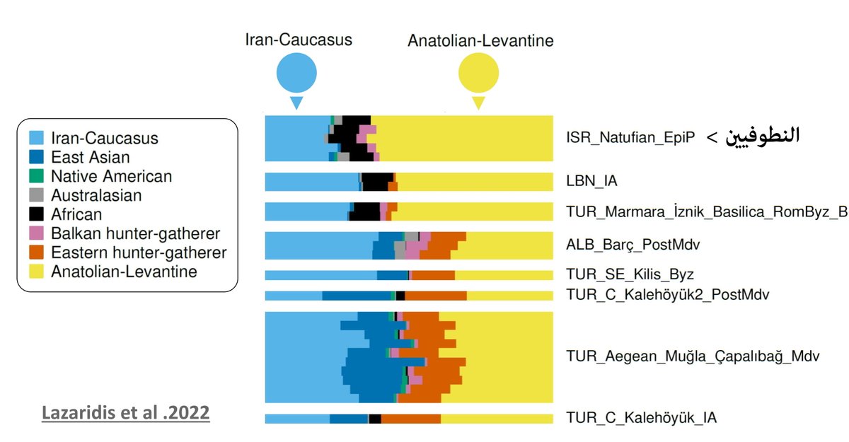 يظهر المكون القوقازي الإيراني بعينات النطوفيين (بالنفسجي)
