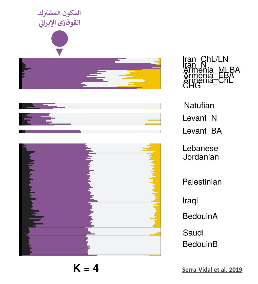 يظهر المكون المشترك القوقازي الإيراني (بالبنفسجي) بعينات النطوفيين والشام النيوليثي، ثم تزاد نسبته بالشام البرونزي