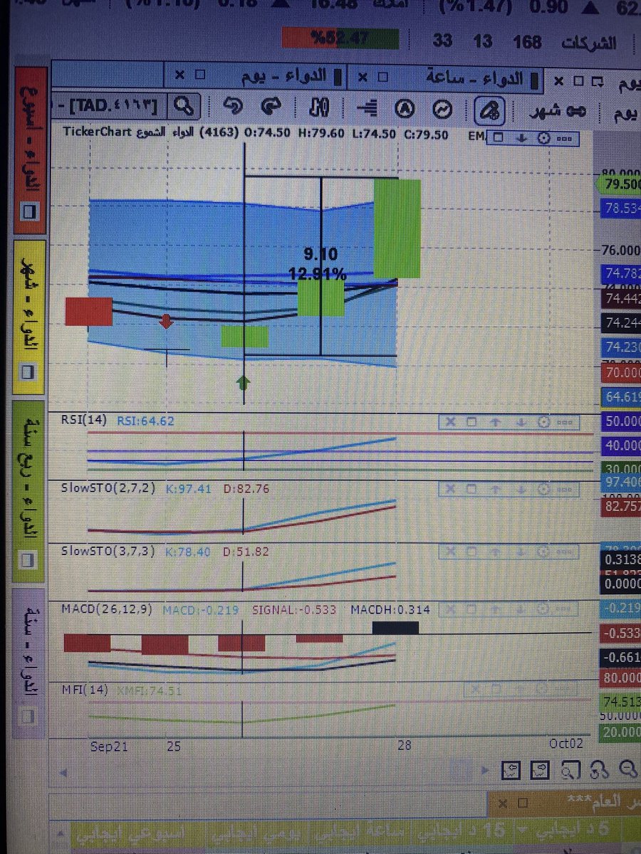 سهم الدواء على اليومي بأستراتيجية kag للمؤشرات الفنيه وأعطى إشارة دخول قبل يومين وصعد من ٧٠.٥٠ إلى اليوم ٧٩.٦٠ بنسبة ١٢.٩٪ حوالي ٩ ريال