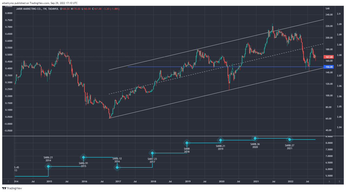 نلاحظ أن السهم لا يغيب عن مناطق فوق 100 ريال لأكثر من سنتين و هو قادر على الوصول لها مستقبلا بإذن الله