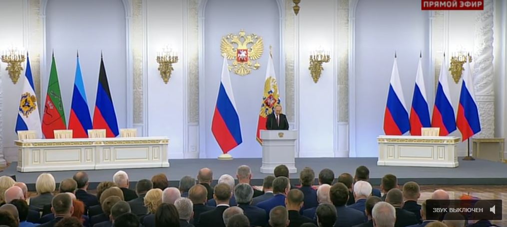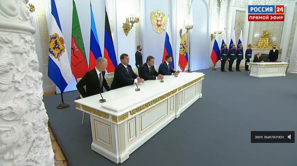 بوتين يعلن رسميًا البدء بتوقيع ضمّ أراضي أوكرانية إلى روسيا، ويأمر الجميع بوقف دقيقة صمت كحداء لجميع الأبطال الذين ضحّوا "لاستعادة هذه الأراضي"