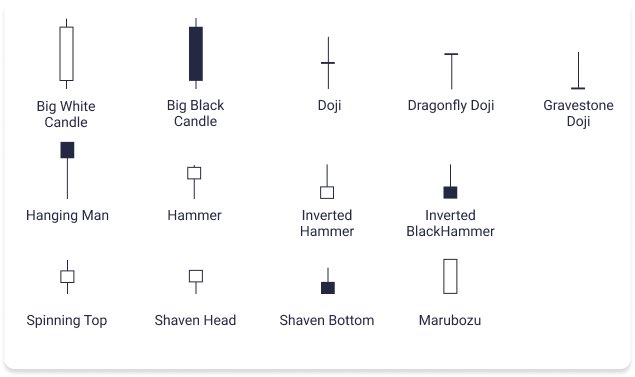 الشمعة اليابانية تتكون من جسم الشمعة والذيل العلوي والذيل السفلي ، إذا كان الإغلاق فوق سعر الفتح تسمى شمعة شراء وان كان الاغلاق اقل من سعر الفتح تسمى شمعة بيع .