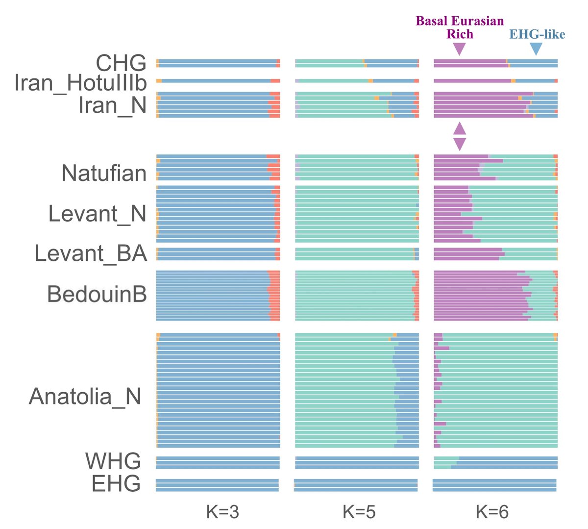 5) عينات الأناضول النيوليثي (ذات المكون الأخضر عند K=6) تحمل نسبة معتدلة من البازال الأوراسي بناء على دراسات سابقة