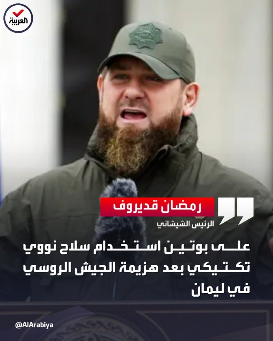 هكذا طلب الرئيس الشيشاني رمضان من بوتين استخدام الأسلحة النووية منخفضة القوة بعد هزيمة جديدة عندما سيطرت القوات الأوكرانية على مدينة ليمان بمنطقة دونيتسك التي ضمها أمس بوتين إلى روسيا
