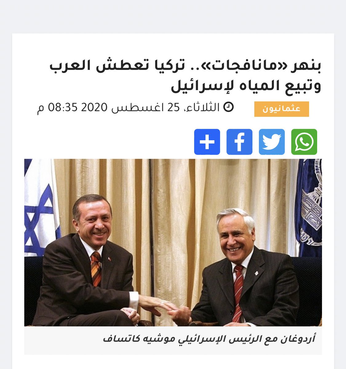 "بعد ذلك حاولت تركيا تعزيز علاقتها بإسرائيل فوجهت اهتمامها إلى مشروع بيع مياه الشرب لإسرائيل عن طريق استثمار أنهارها في هذا المشروع ، وخاصة نهر مانواجات (Manavgat) ، ولكن الدول العربية أعربت عن قلقها من هذا المشروع ، كما قامت العراق بوقف الشاحنات التركية