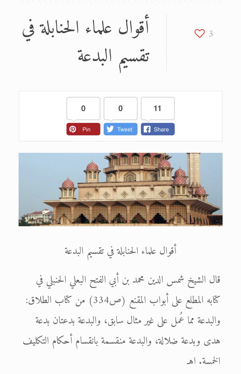 والبدعة مما عُمل على غير مثال سابق، والبدعة بدعتان بدعة هدى وبدعة ضلالة، والبدعة منقسمة بانقسام أحكام التكليف الخمسة. اهـ