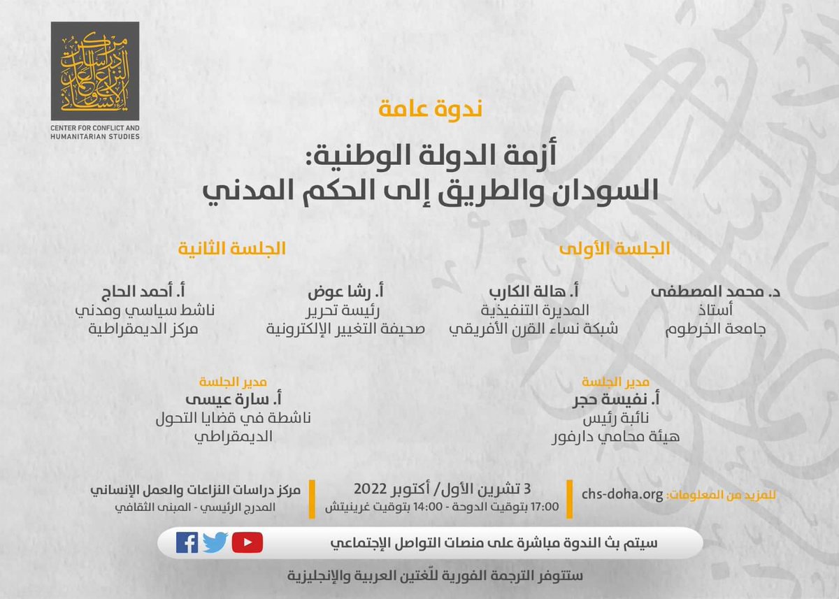 وايضا متابعة الندوة بعنوان(ازمة الدولة الوطنية: السودان والطريق الى الدولة المدنية)في تمام الخامسة مساء الاثنين بتوقيت الدوحة الموافق ٣ أكتوبر ٢٠٢٢ وذلك على منصات المركز على فيسبوك وتويتر .