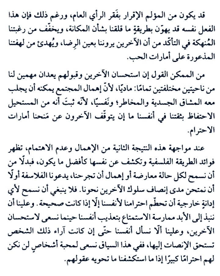 ولذلك كان تجاهل الآراء غير المنصفة وعدم الإهتمام بما يظنه الآخرين-الغرباء خاصة-عنك؛مصدر قوة واستقلال ومن مصادر السعادة والسكينة،والوقائع تثبت أن يستحيل نيل رضى الناس مطلقاً لتفاوت افهامهم وماتضمره ضمائرهم وعاطفتهم من ميل قد يخفى حتى عليهم وهذا الميل يفضي إلى الحكم المسبق والتحيز=
