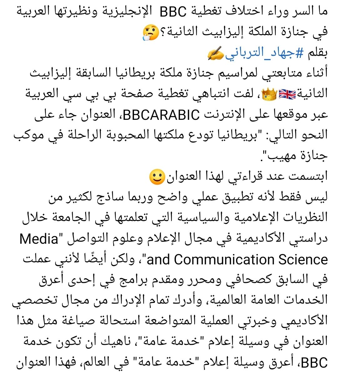 أثناء متابعتي لمراسيم جنازة ملكة بريطانيا السابقة🇬🇧👑، لفت انتباهي تغطية بي بي سي العربية عن نظيرتها الإنجليزية