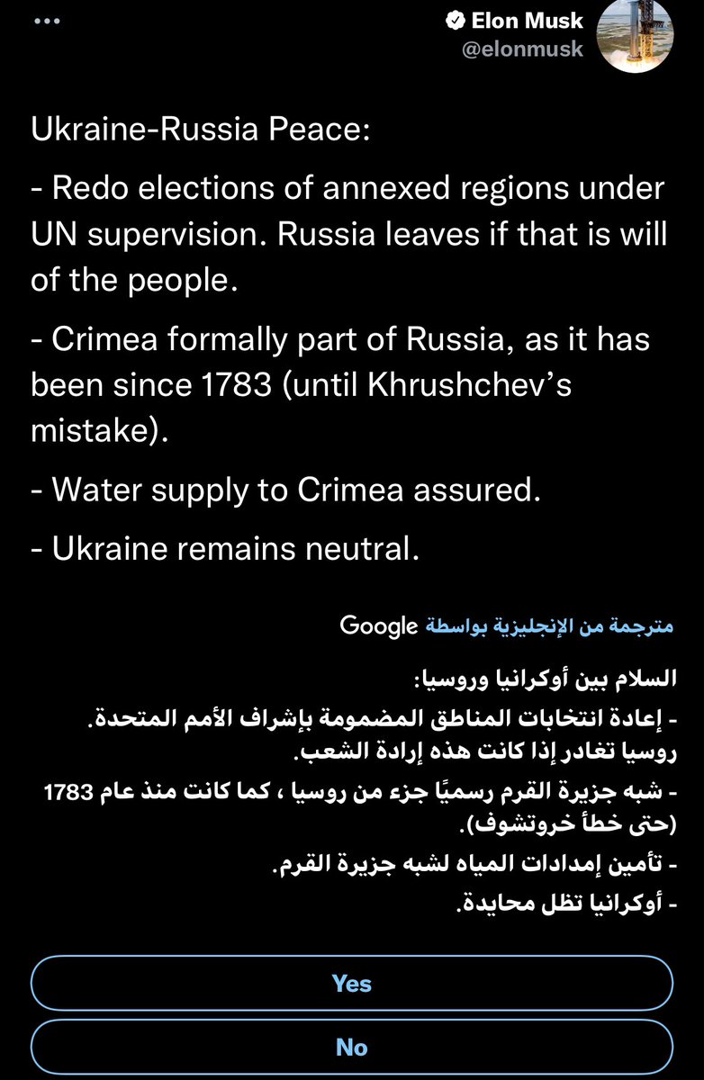قدم إيلون ماسك حلاً لسلام بين روسيا وأوكرانيا لإيقاف الحرب وهو أن تكون شبه جزيرة القرم كجزء من روسيا كما كانت منذُ 1783 مع إجراء استفتاءات جديدة تحت إشراف الأمم المتحدة في دونباس وخيرسون وزابوريجيا وقال: