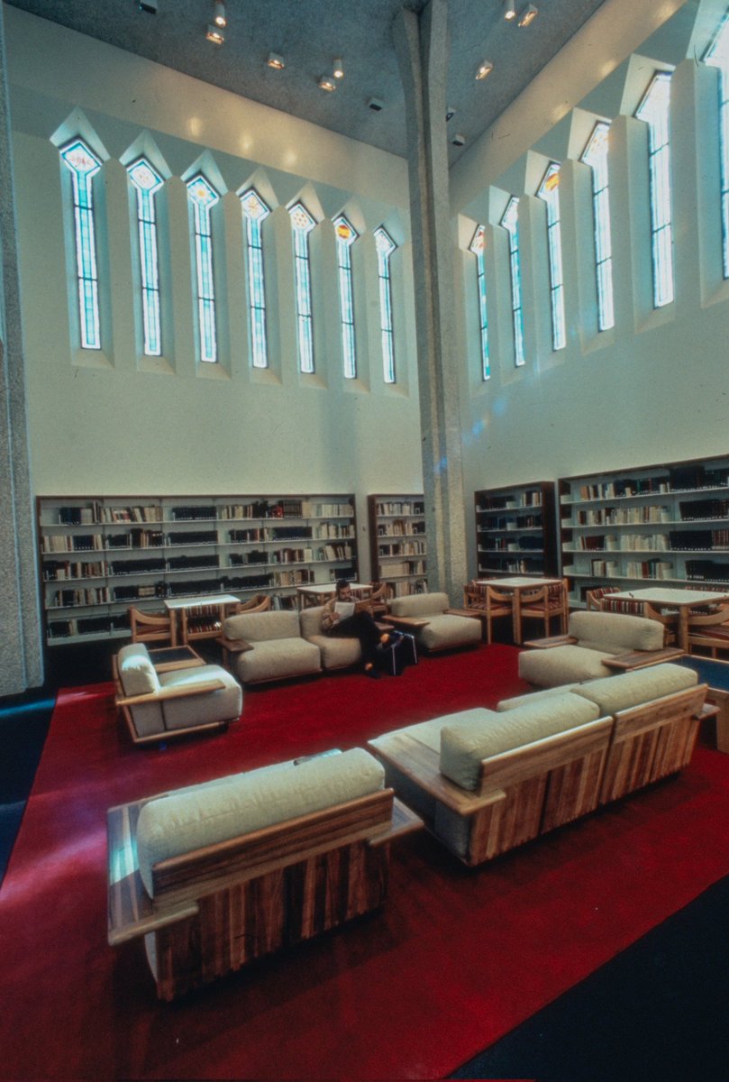 49》أما المكتبة الجديدة في مبناها الجميل، فجُهزت في بداية الأمر بنحو 250000 مجلد يمكن زيادتها الى 400000 مجلد، وضمت المكتبة مركزاً للدراسة بوسائل الايضاح السمعية - البصرية، وكذلك أماكن فسيحة للمطالعة الخفيفة بالإضافة الى مقصورات متنقلة للدراسة الجدية.
