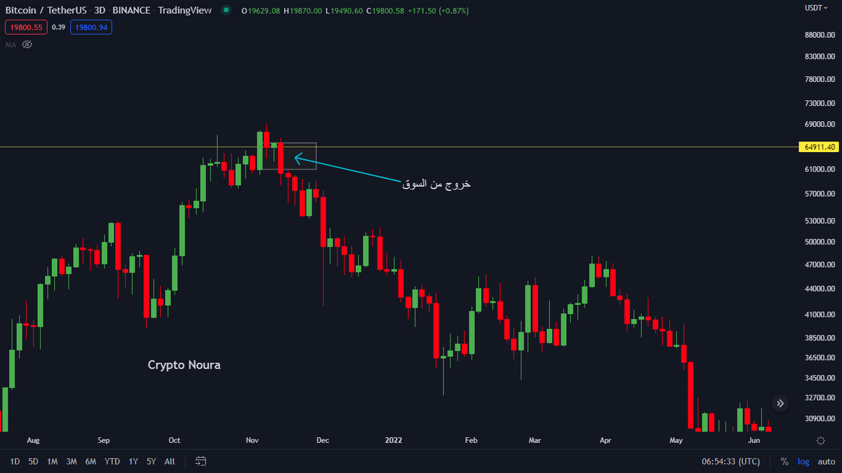 في الشكل السابق على شارت البيتكوين حدث كسر كاذب عن النقطة 2 فقط ولم يحدث عن النقطة 1 لأن السعر لم يتخطي مستوى الدعم أما في 2 فقط تخطى السعر مستوى المقاومة 64900 ثم أغلق أسفل منه.