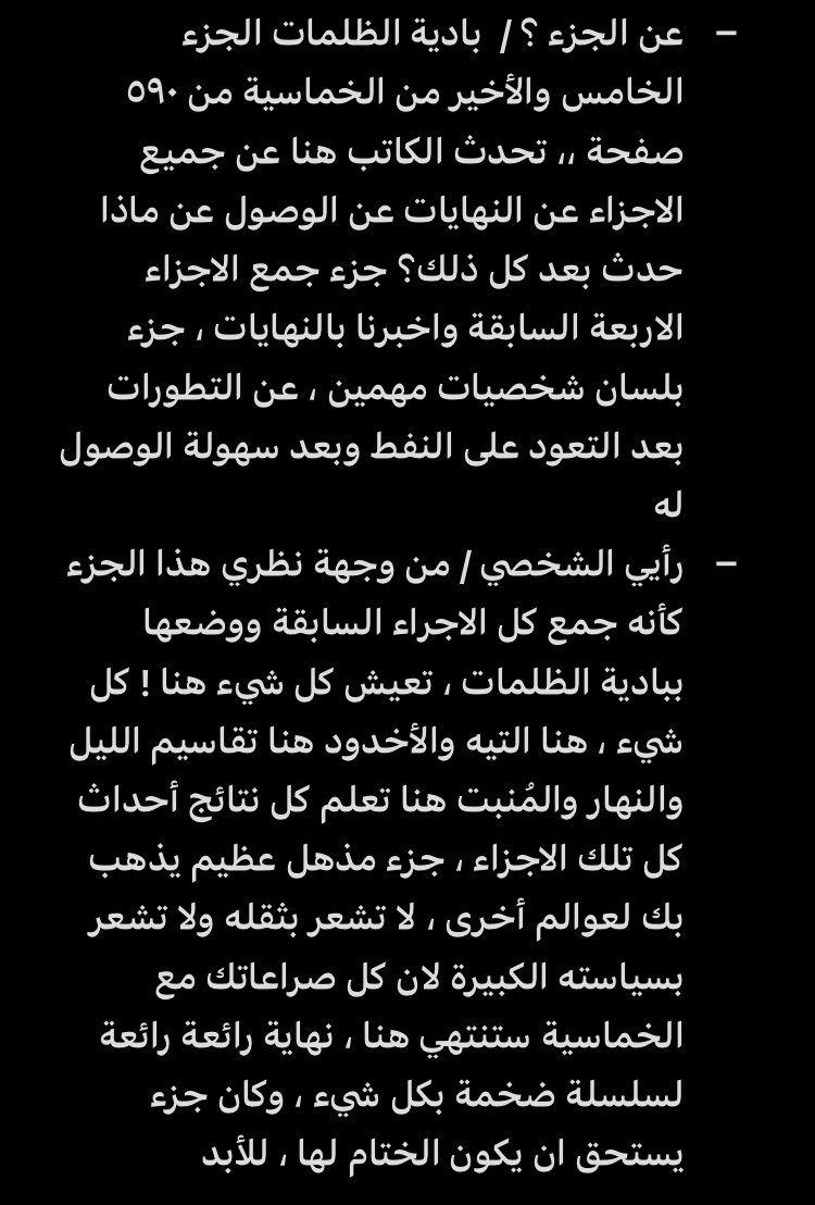 أنتهى الثريد ، اتمنى استفدتو ، بالنهاية أنا من محبين الكاتب الا ان انصح بعدم البدء فيها ولابد قرأتها بظروف نفسية مناسبة ، سلسلة لا تُنسى برغم صعوبتها وثقلها