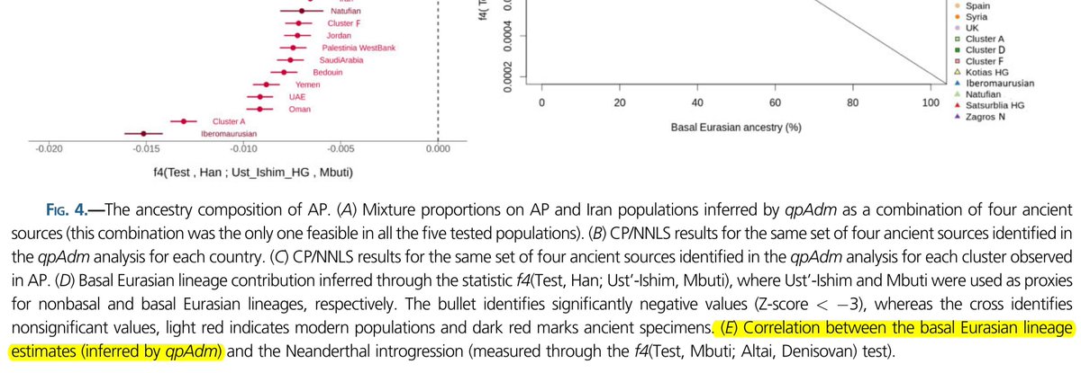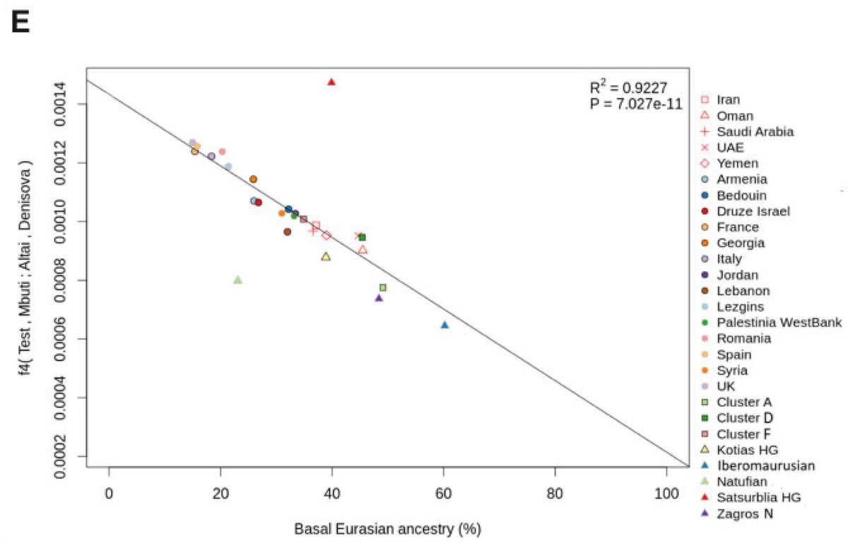 (E) Correlation between the basal Eurasian lineage estimates (inferred by qpAdm) and the Neanderthal introgression (measured through the f4(Test, Mbuti; Altai, Denisovan) test)