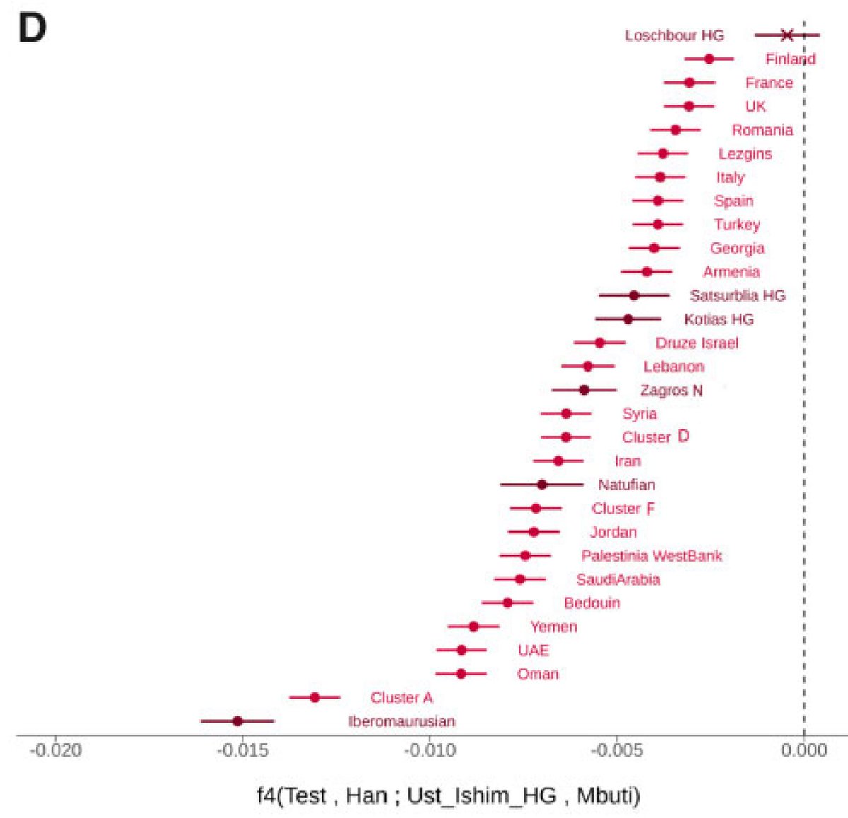 (D) Basal Eurasian lineage contribution inferred through the statistic f4(Test, Han; Ust’-Ishim, Mbuti), where Ust’-Ishim and Mbuti were used as proxies for nonbasal and basal Eurasian lineages, respectively