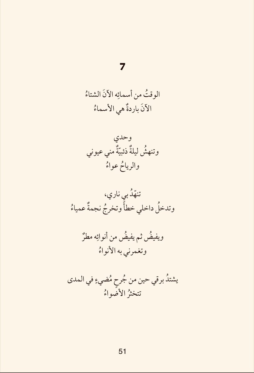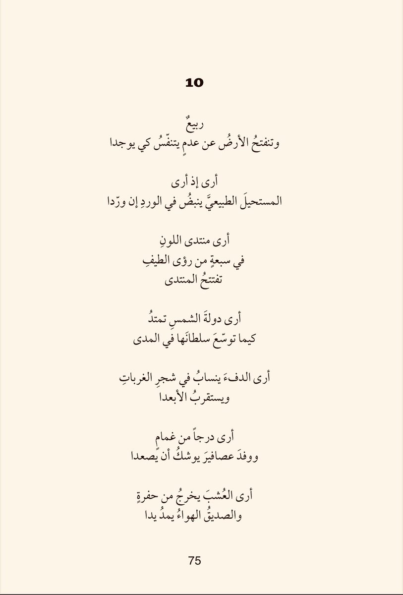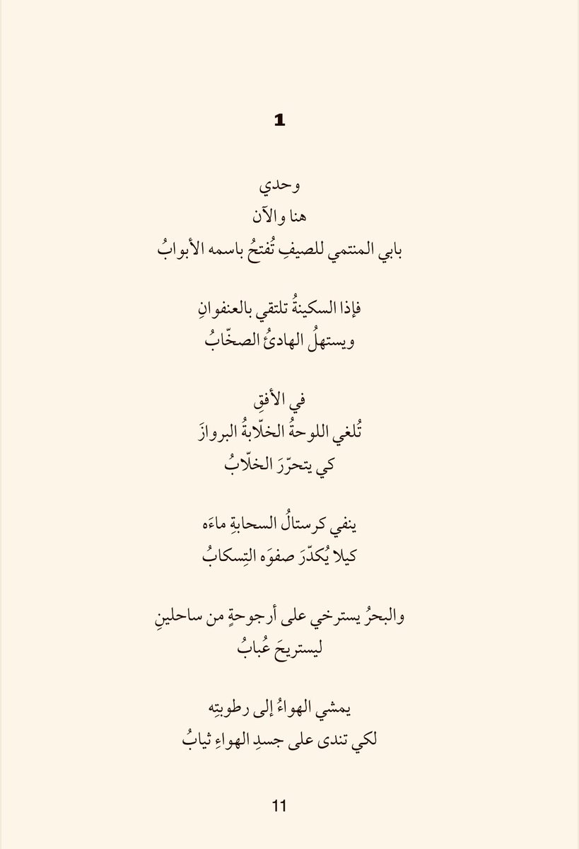 ثمّ السخيّةُ بالمسافةِ حينما * مني يرفرفُ طائرٌ جوّابُ * شمسانِ لي شمسٌ -وتوضحني- بها * يمتدّ من قلقِ السؤالِ جوابُ * شمسٌ وتصهرُ نفسَها وشعاعُها * ذهبٌ على جسدِ المكانِ مُذابُ * عُشبانِ لي عُشبٌ بريءٌ حين تلب * بسُ ثوبَ أخضرها الجديد هضابُ =