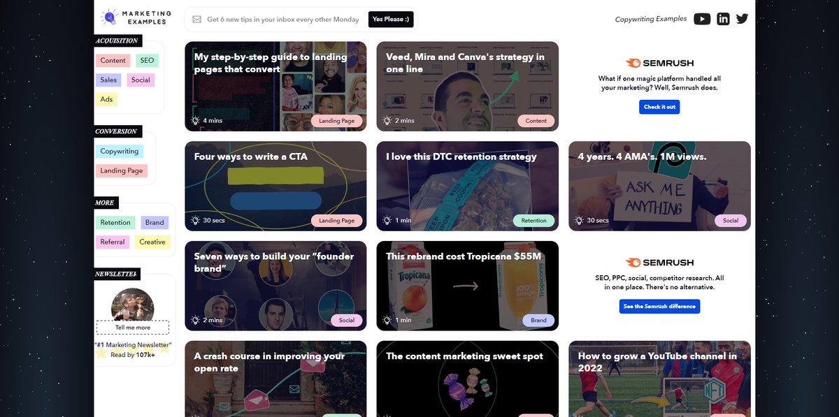Esta web tiene un buen recopilatorio de buenas muestras de marketing y copy que, aparte de aprender, puedes usarlas de inspiración para tus propios textos, tu web, tus anuncios, etc.