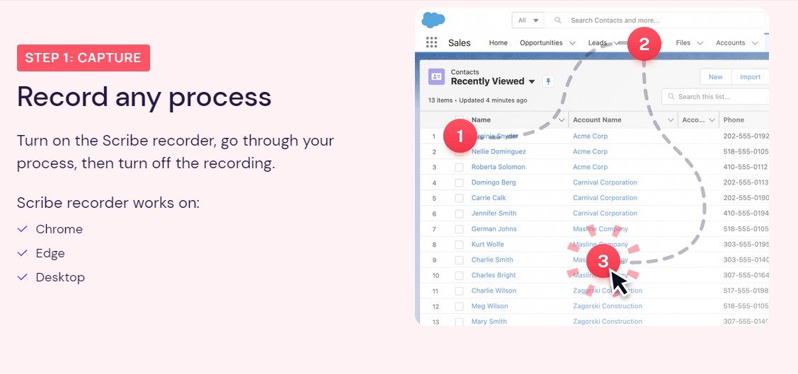 Además de grabar tu pantalla, identifica automáticamente todas las acciones que haces y las muestra como un tutorial, paso a paso.