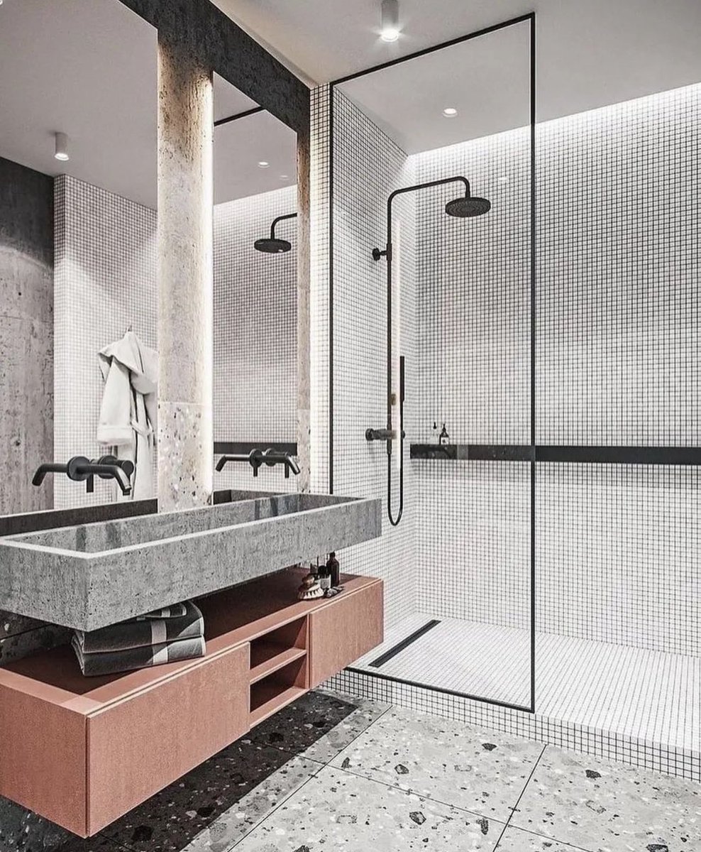 #الحمامات عمل تجويفات واضافه اضاءه مخفيه والالوان تكون فاتحه اذا كانت المساحه صغيره ، ارفف التخزين والكرسي المعلق تعطي ايحاء بالاتساع وايضاً لسهولة التنظيف ، مقاسات البلاط تكون كبيره ،والارضيات والجدران بنفس اللون ،و الصفايات تكون مخفيه و وضع زجاج لمنطقه الشور 👍🏻
